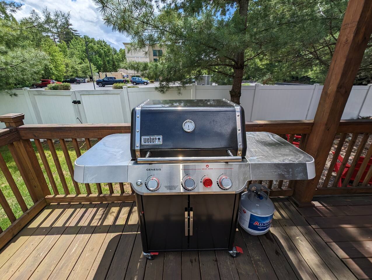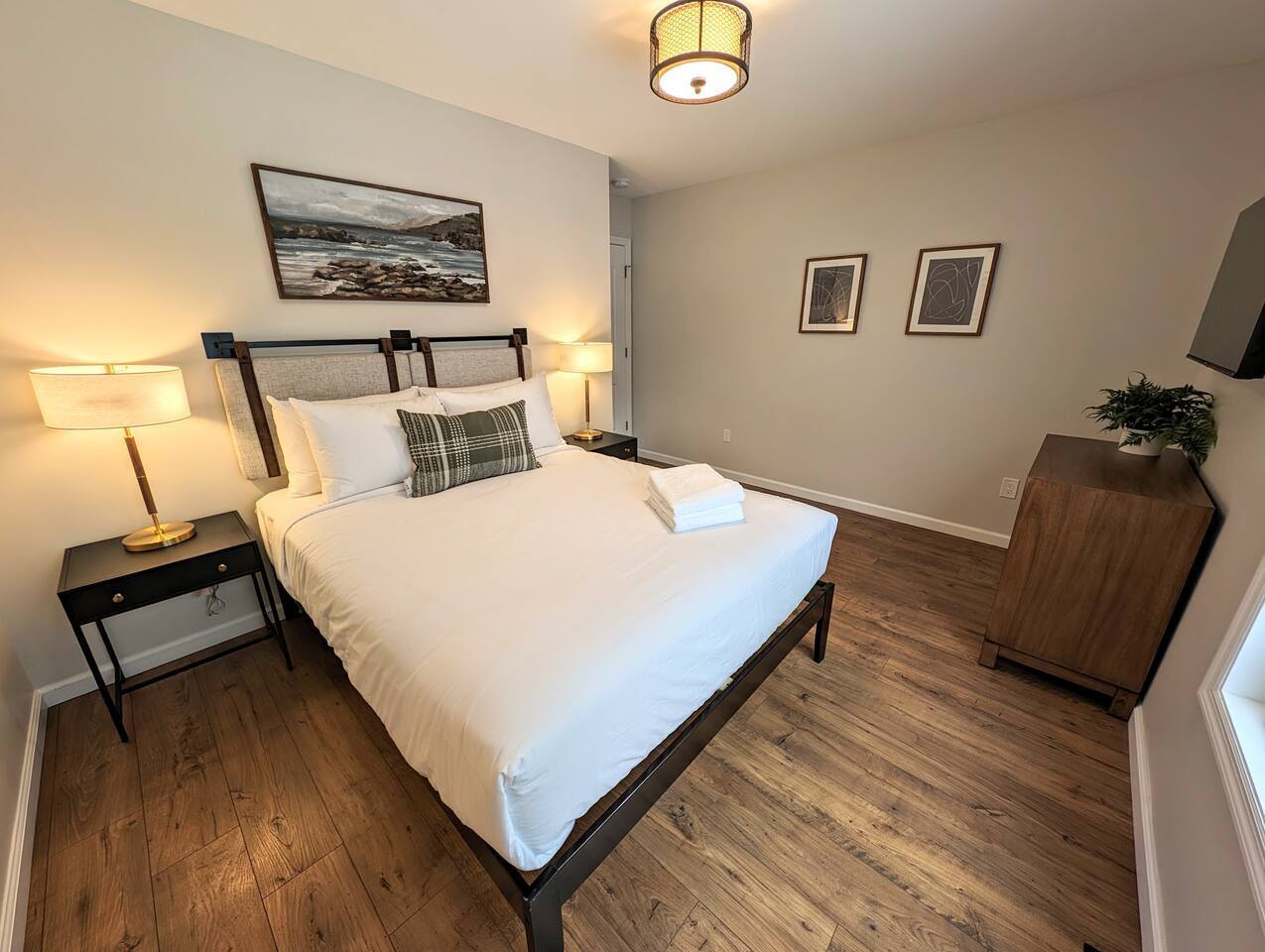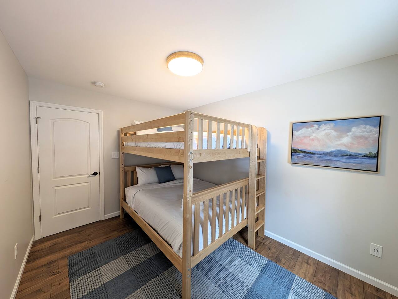 The open floor plan features a large kitchen, dining table and chairs for 8, and plenty of seating in the living area. The three bedrooms all include queen size beds and wall-mounted TVs. The master bedroom features a spacious ensuite bathroom with walk-in shower, double sinks, and a large walk-in closet. A second bedroom has an ensuite bathroom with a bathtub & shower. The third bedroom features a queen-over-queen bunk bed. Outside you will find a wrap-around deck with a large hot tub, gas grill, and dining for 6 (March – Dec). The home has high-speed Wi-Fi and YouTubeTV is provided on all TVs.